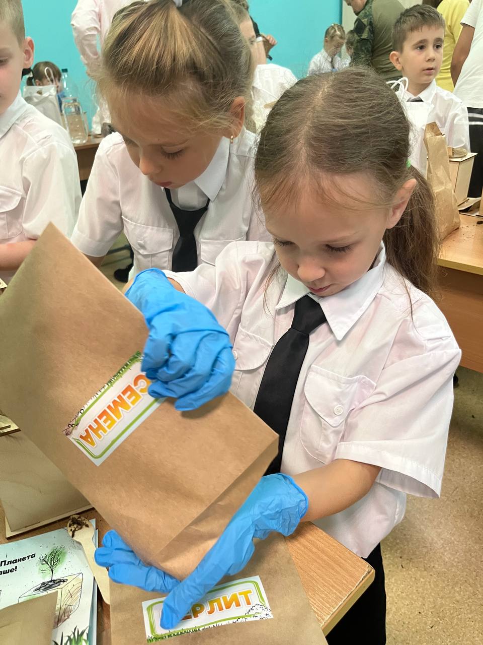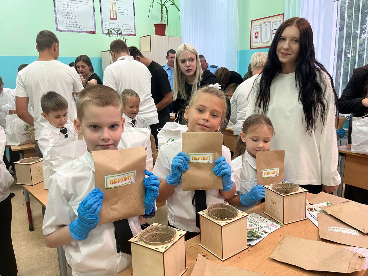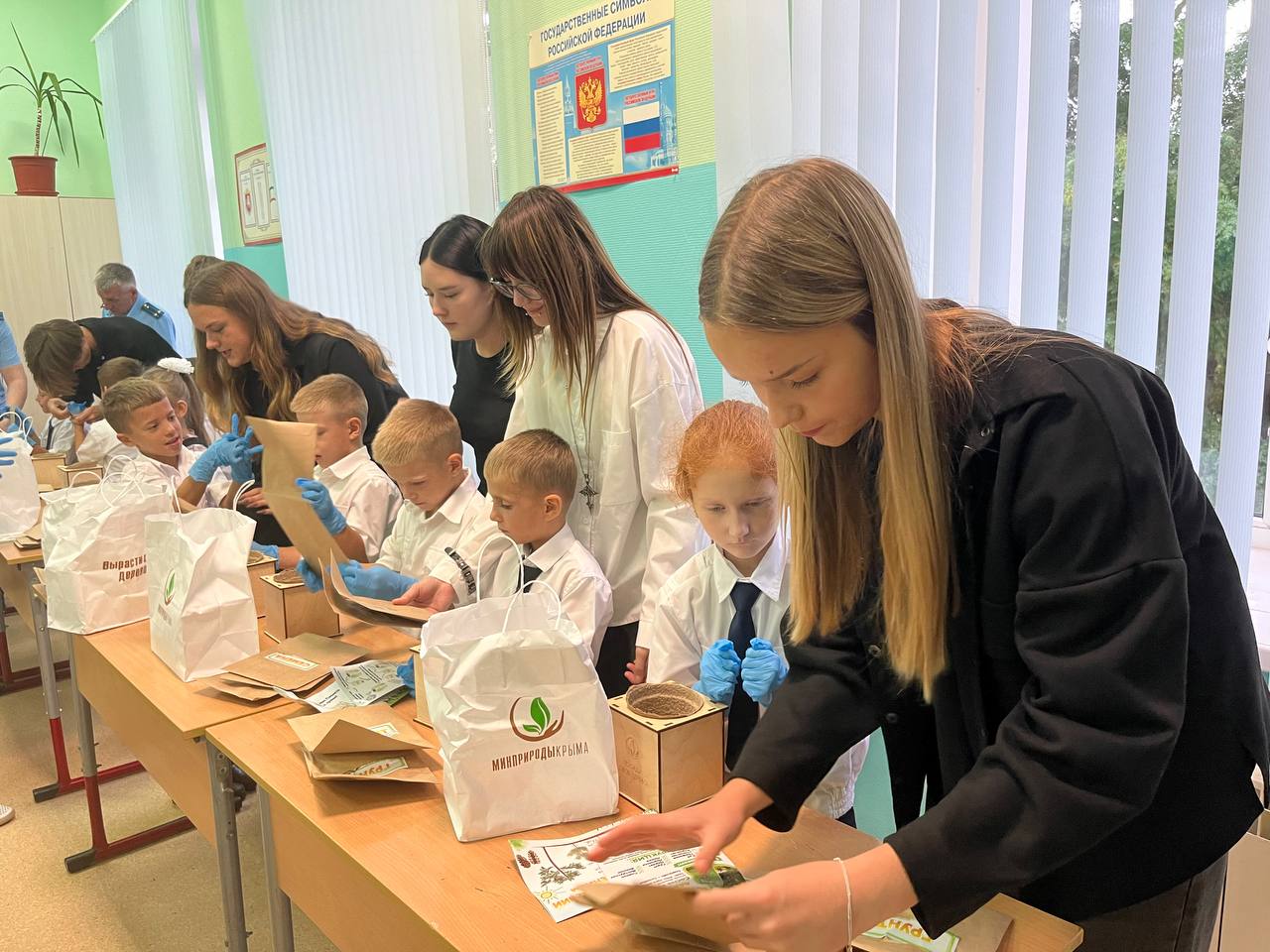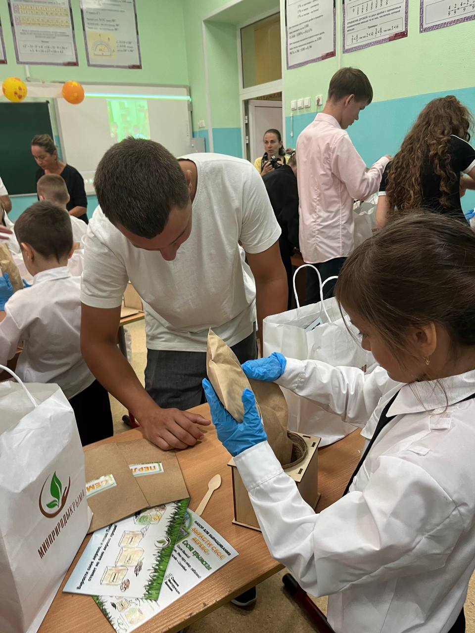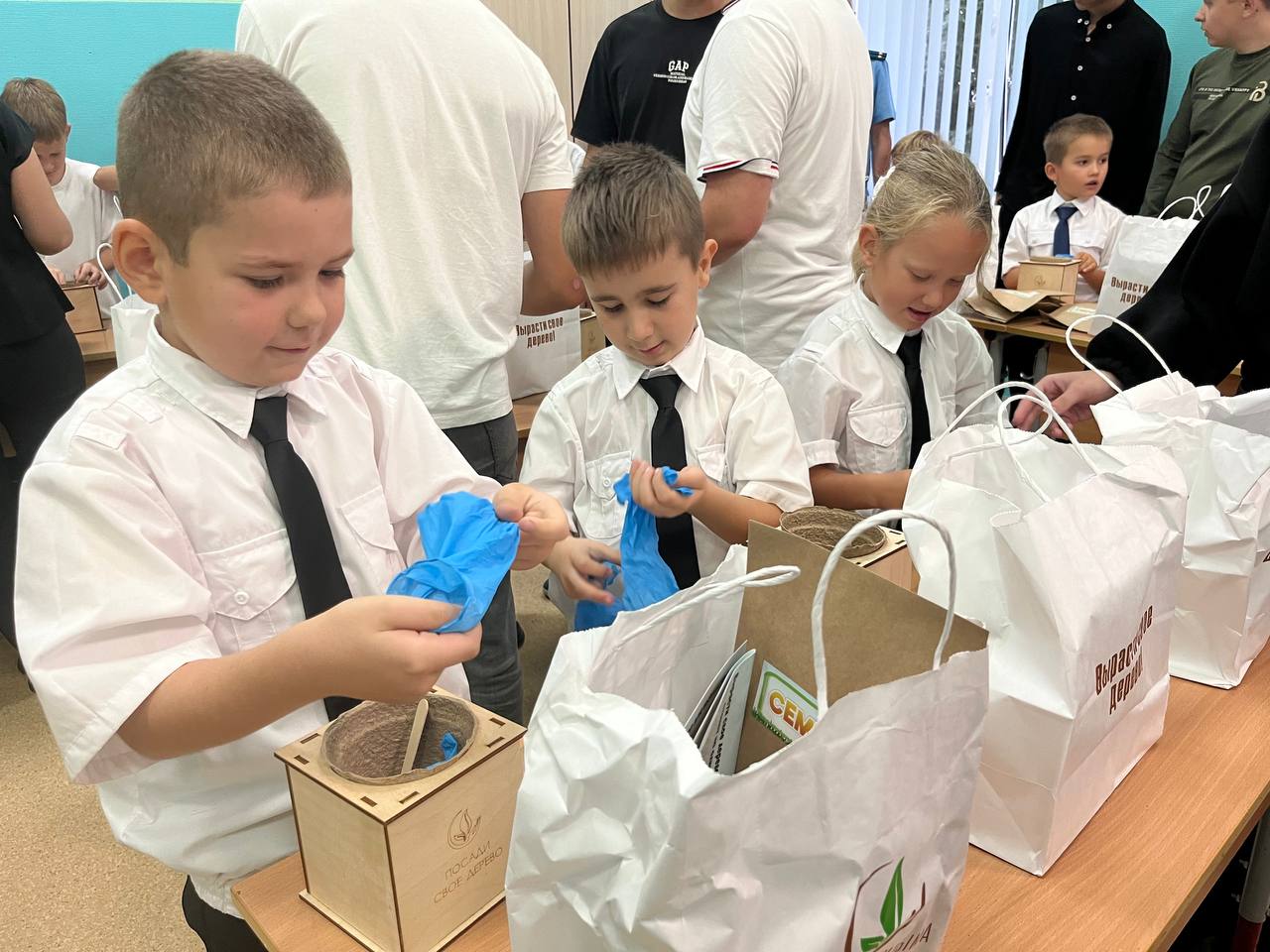 Школьники посеяли семена Сосны Крымской, а также узнали, как правильно ухаживать за растением. Помогали первоклассникам ученики 11-х классов – показывали ребятам нужные пакетики с материалами, а также поливали семена после посева.