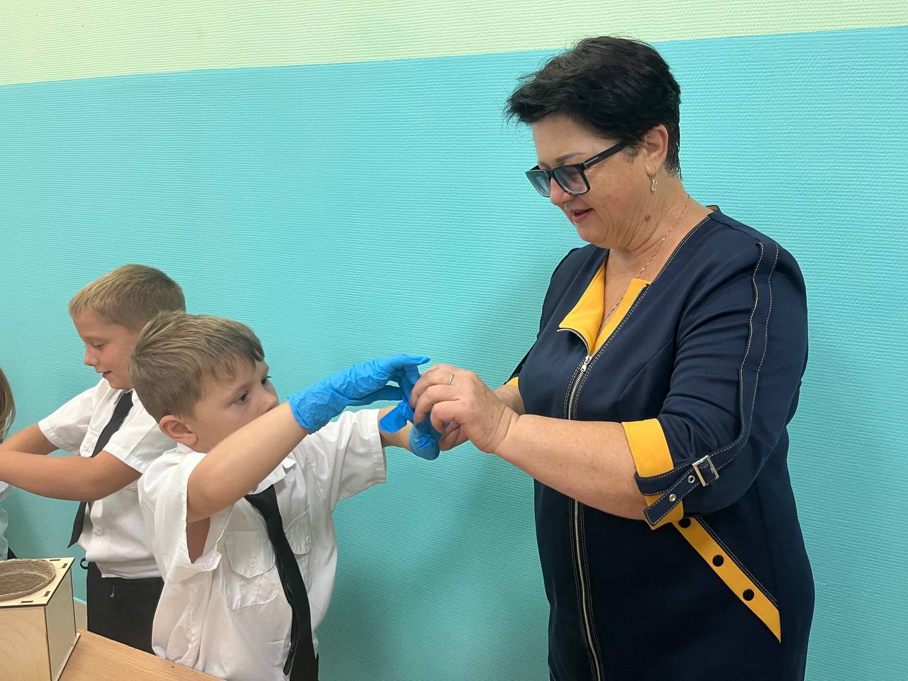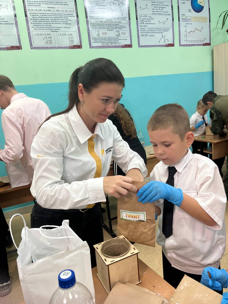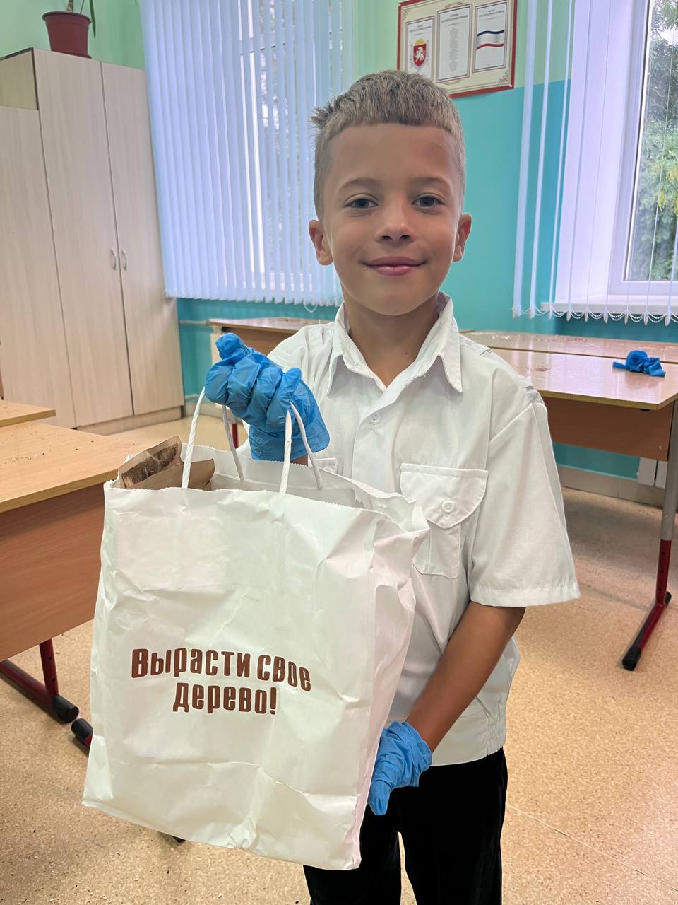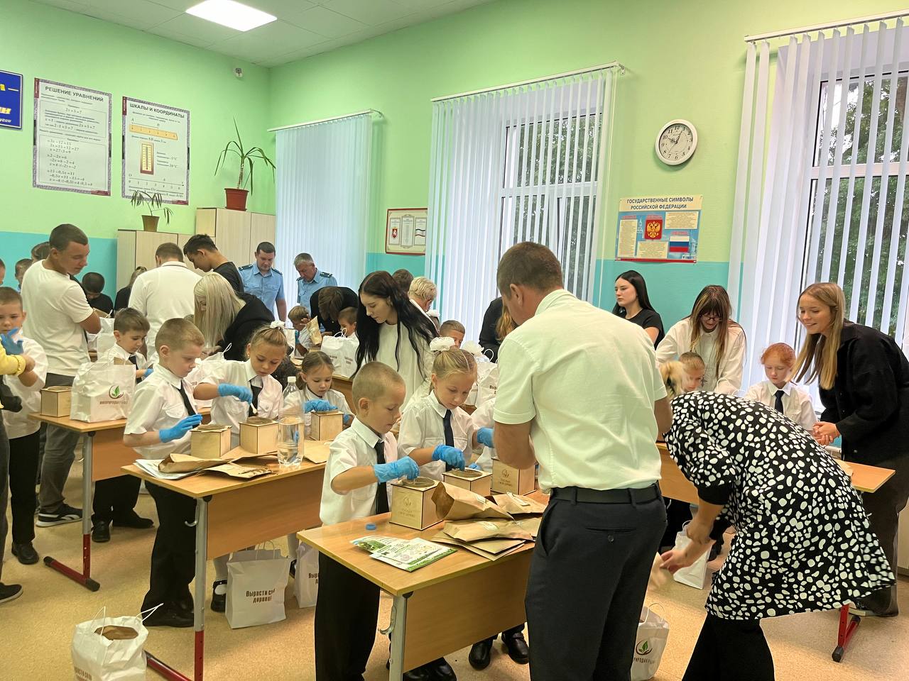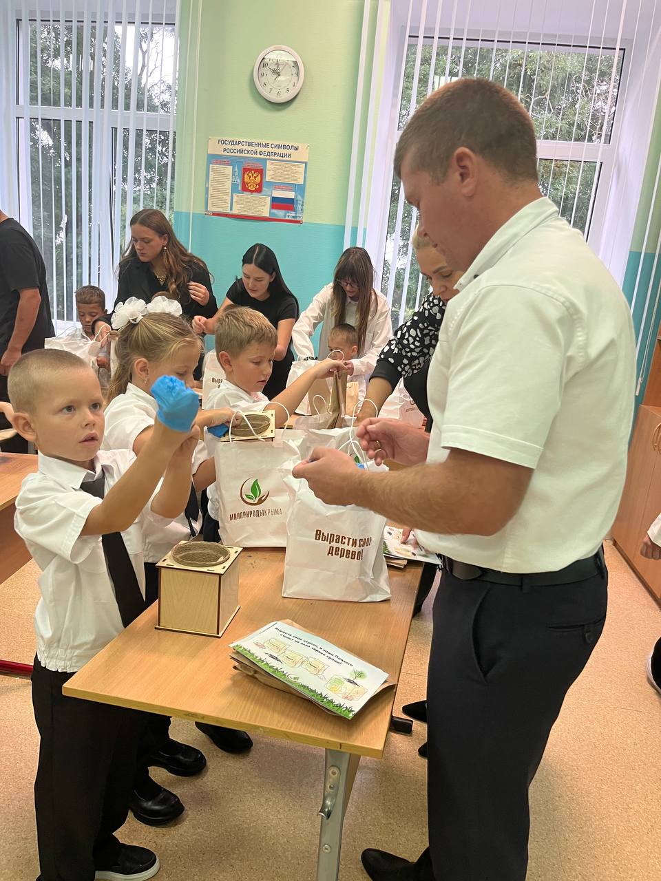 Школьники посеяли семена Сосны Крымской, а также узнали, как правильно ухаживать за растением. Помогали первоклассникам ученики 11-х классов – показывали ребятам нужные пакетики с материалами, а также поливали семена после посева.