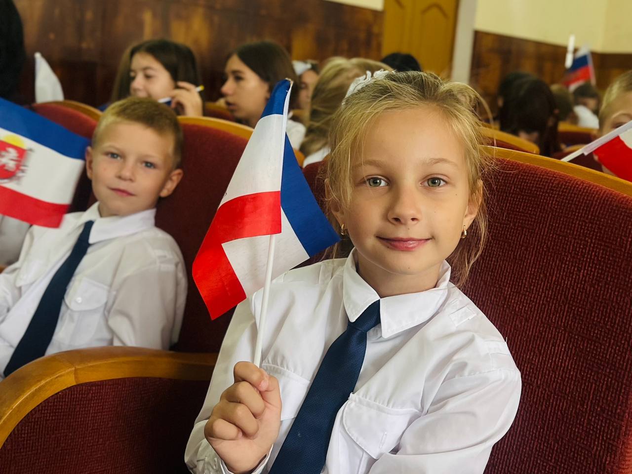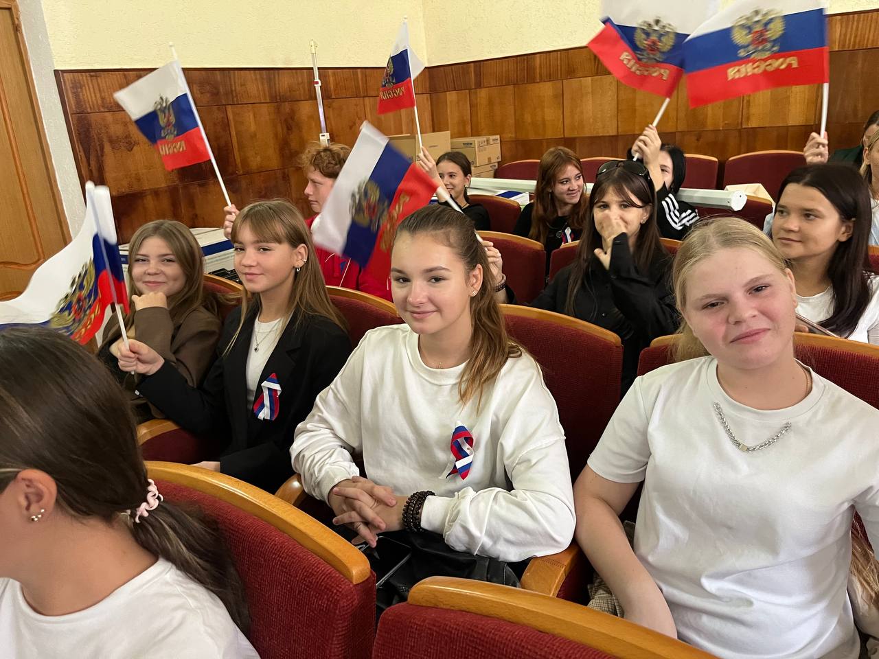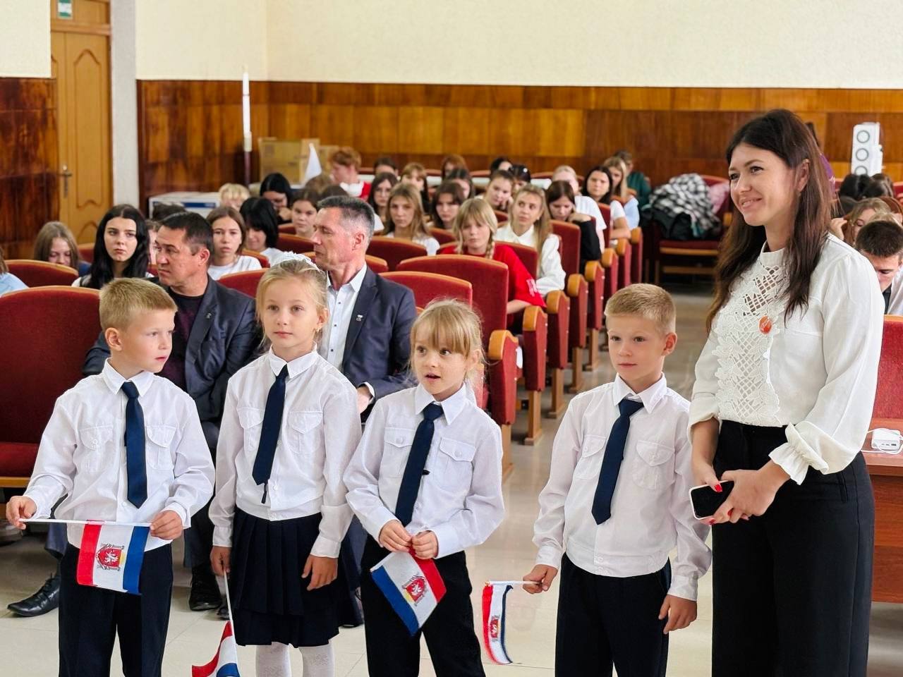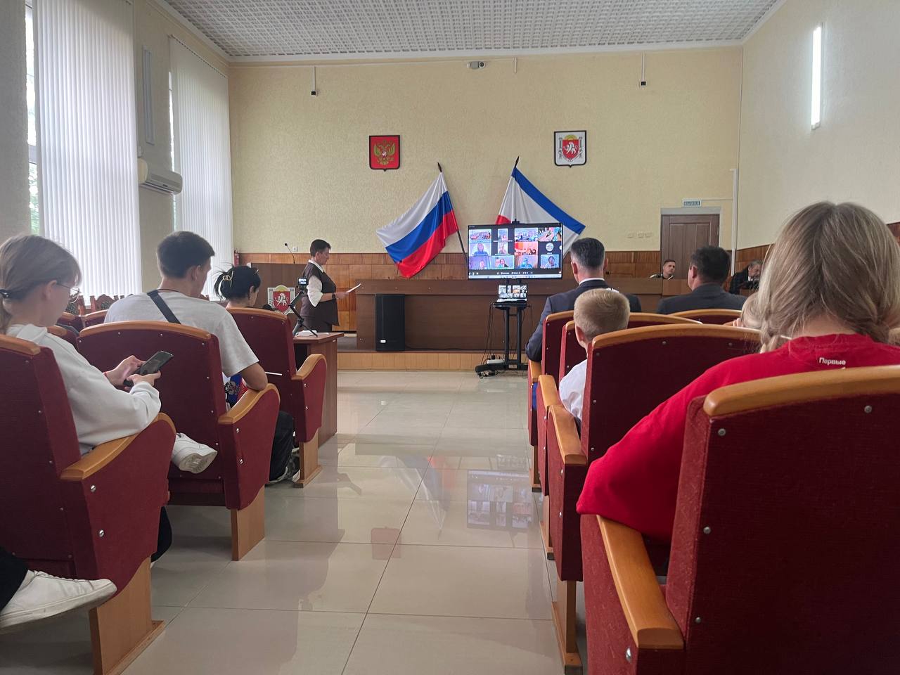 Экран, установленный в центре зала, стал окном в новую реальность, соединив сердца жителей Черноморского района с представителями братских регионов. В зале царила атмосфера единства и воодушевления.