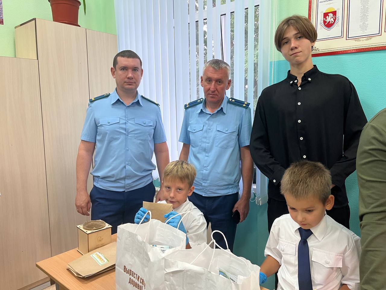 На мероприятии присутствовали прокурор Черноморского района Константин Банников, заместитель прокурора Олег Падалка, заместитель начальника отделения (пограничной заставы) в населенном пункте Черноморское Пограничного управления ФСБ России по Республике Крым Сергей Сорокин, которые взяли шефство над двумя первыми кадетскими классами, а также партнер и помощник нашей школы Сергей Мельниченко.